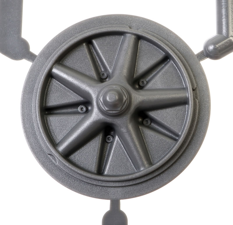 Detail is excellent throughout. The double armour shield is correctly represented, the breech may be posed in multiple positions, and the carriage is detailed and convincing. The trailing legs are workable, allowing the model to be posed in either firing or towed configuration.