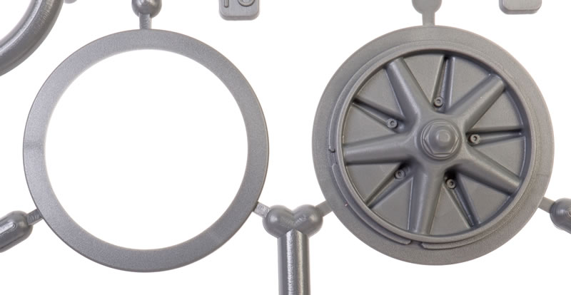 Each road wheel is made up of four plastic parts – central wheel, outer and inner tyres, and the wheel hub. A note in the instructions directs cutting the polythene caps. Don’t forget to do this.
