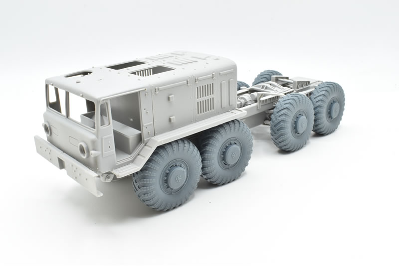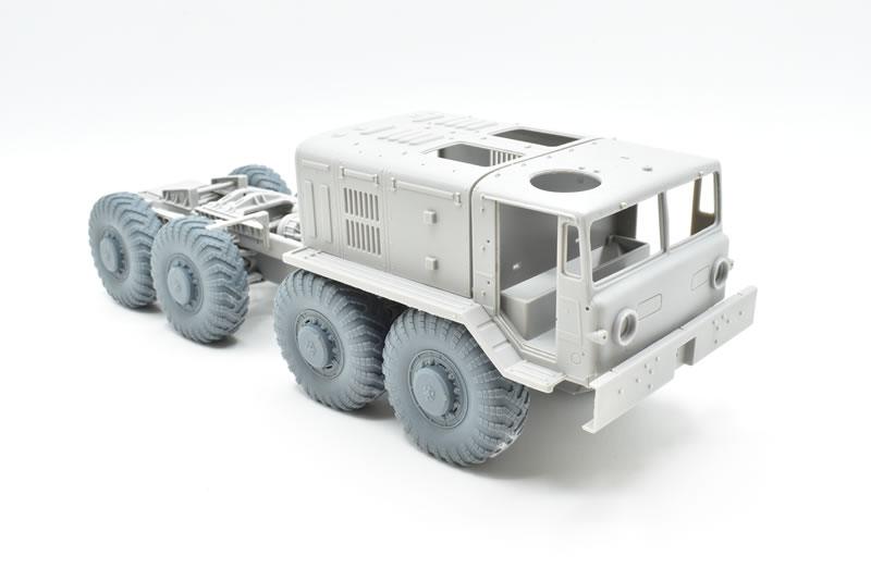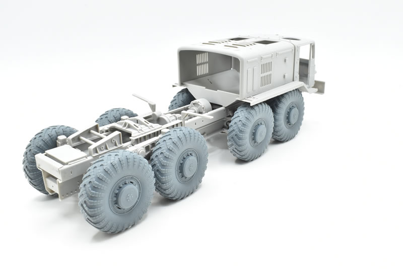 The kit tyres are overly smooth and perfectly round — lacking the realistic flattening and tread detail of the real thing — and both the truck and trailer wheels fit loosely, tending to pop off or slide sideways at exactly the wrong moment. In short, the wheels have long been the Achilles’ heel of Trumpeter’s MAZ series.