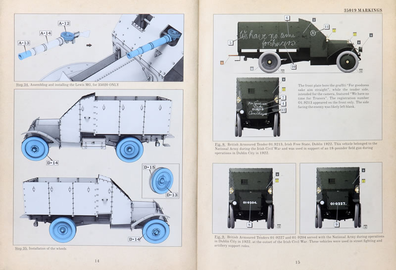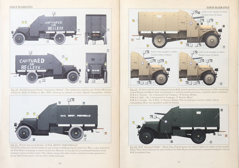 The instructions are presented as a clear, colour-keyed 18-page booklet, with logical assembly sequences and integrated painting guidance. Note that while the instructions also cover Irish Civil War versions, in this boxing, decals are provided only for the RAF Middle Eastern vehicles.