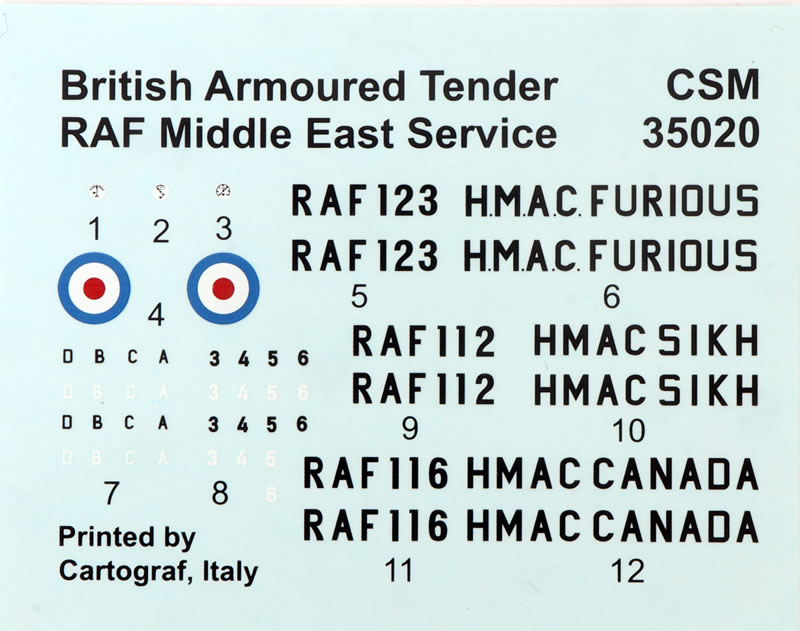 Four RAF Middle East marking options are supplied: three vehicles in overall Sand and one Armoured Tender finished in overall Green.