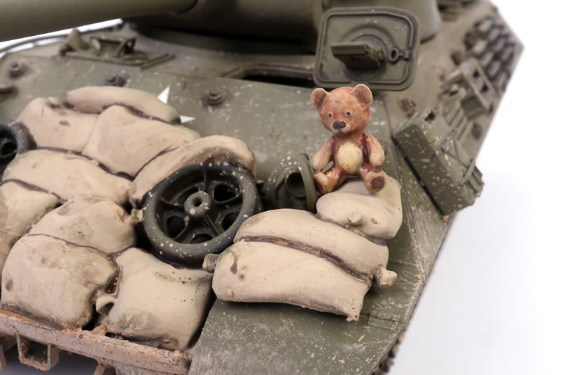 Although Tamiya includes some stowage in the form of packs and rolls, I decided to add more. I was drawn to Sol Resin Factory’s Item No. MM685 “Accessories Set for M10” mainly because of the teddy bear perched on the front hull.