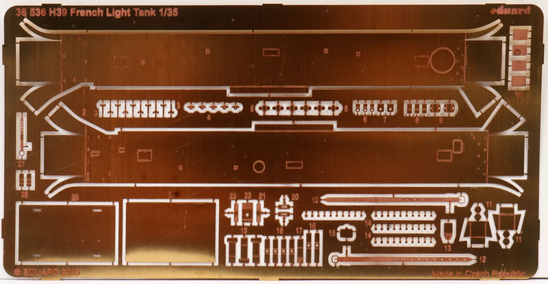 | Stock Number, Description and Price | Eduard Item No. 36536 - H39 French Light Tank Photo-Etched Detail Set for Tamiya USD$24.95 plus shipping available online from Eduard's online store. |