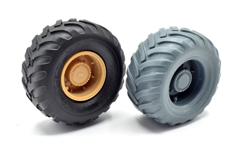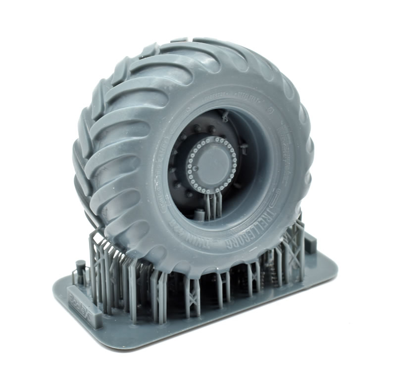 Turning to the ScaleX sagged wheels, these are a jewel. The set of six large, weighty tyres is beautifully rendered, with crisp detail typical of high-quality 3D printing. The subtle bulging effect is convincingly done and well supported by reference photos.