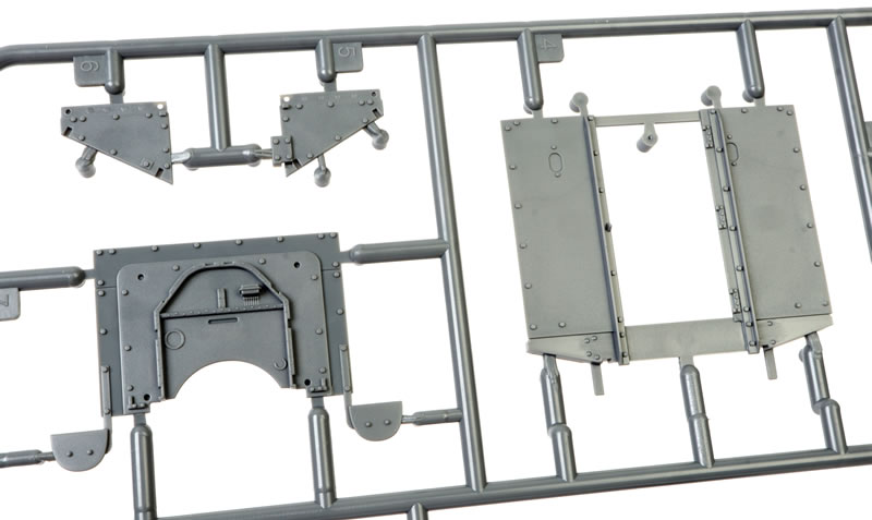 The armoured body is broken down into separate side, front and rear panels, with a poseable rear hatch provided as a separate part. Inside, the modeller is treated to a petrol tank, structural frames and wooden bench seating. The engine compartment also features separate armour panels on the front and sides.