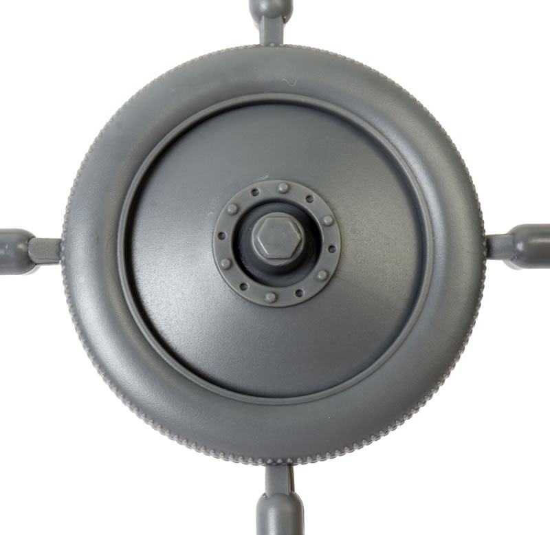 The wheels are moulded in plastic, with the tyre and hub on one side and the opposite tyre half with a blank inner hub on the other. This mates with a corresponding blank disc on the axle, ensuring both a strong joint and perfect alignment.